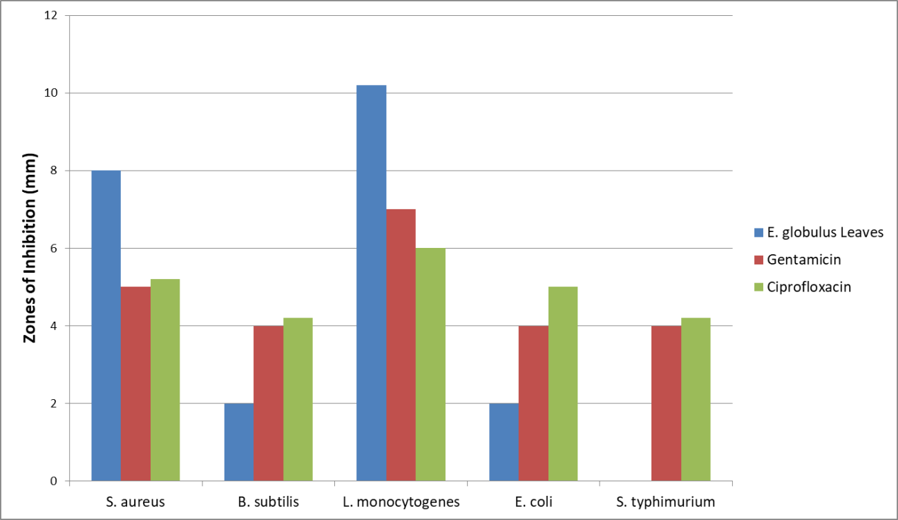 منتول یک ترکیب طبیعی استخراج شده از گیاه نعنا است. این ترکیب ترپنوئیدی دارای اثرات ضد میکروبی علیه باکتریهای پاتوژن از جمله لیستریا مونوسیتوژنز، باسیلوس سرئوس، اشریشیاکلی، باسیلوس سوبتیلیس، استافیلوکوکوس آرئوس، قارچها و مخمرها است. همچنین عصاره اکالیپتوس به واسطه داشتن ترکیبات فنولی، دارای اثرات ضد باکتریایی قابل ملاحظهای در مقایسه با آنتی بیوتیک های جنتامایسین و سیپروفلوکساسین (به عنوان آنتی بیوتیک استاندارد) در محیط آزمایشی بوده که نتایج در نمودار زیر نشان داده شده است(Mikaili et al., 2013; Moges et al., 2024).